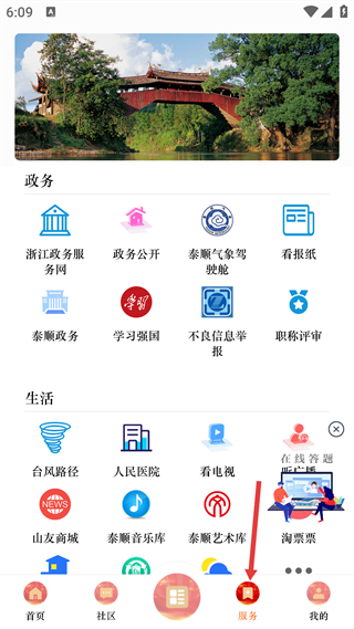 4、進入服務板塊能使用浙江政務服務網等政務工具,以及臺風路徑醫院等生活服務,一站式辦理本地政務與生活事務。