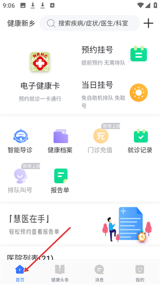 1、首頁,有搜索欄,提供電子健康卡、預約掛號、當日掛號等多項服務,還有智能導診、健康檔案等功能,助力用戶便捷開展醫療服務。