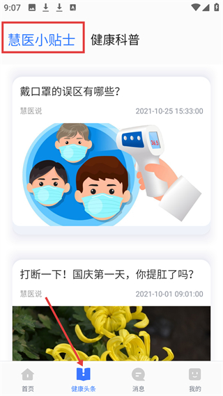2、健康頭條慧醫小貼士,展示戴口罩誤區、提肛健康等資訊,為用戶提供日常健康小貼士,提升健康認知。
