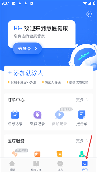 4、我的頁,可登錄賬號、添加就診人,有訂單中心掛號記錄等和醫療服務板塊,方便用戶管理個人醫療服務及健康信息。
