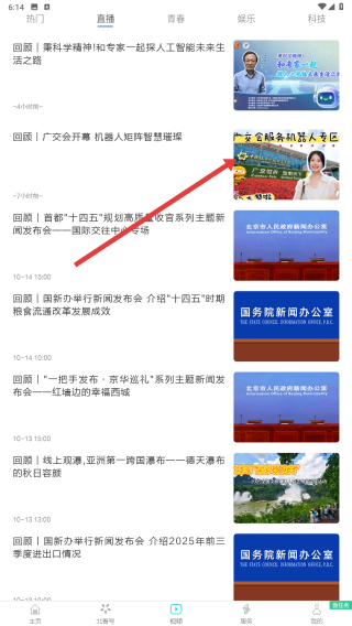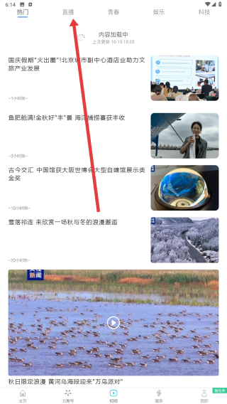 1、打開新聞類APP,在首頁上方可看到直播等分類標簽,點擊直播,進入直播內容頁面。
