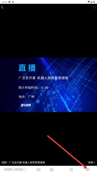 3、進入直播詳情頁后,可查看直播的預計開始時間、地點等信息,若要分享直播,點擊分享按鈕。