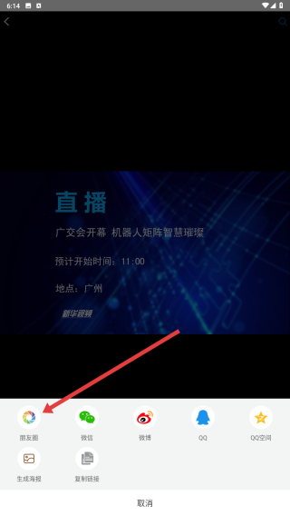 4、點擊分享按鈕后,會彈出分享選項,可選擇朋友圈等分享渠道,將直播分享出去,讓更多人看到。