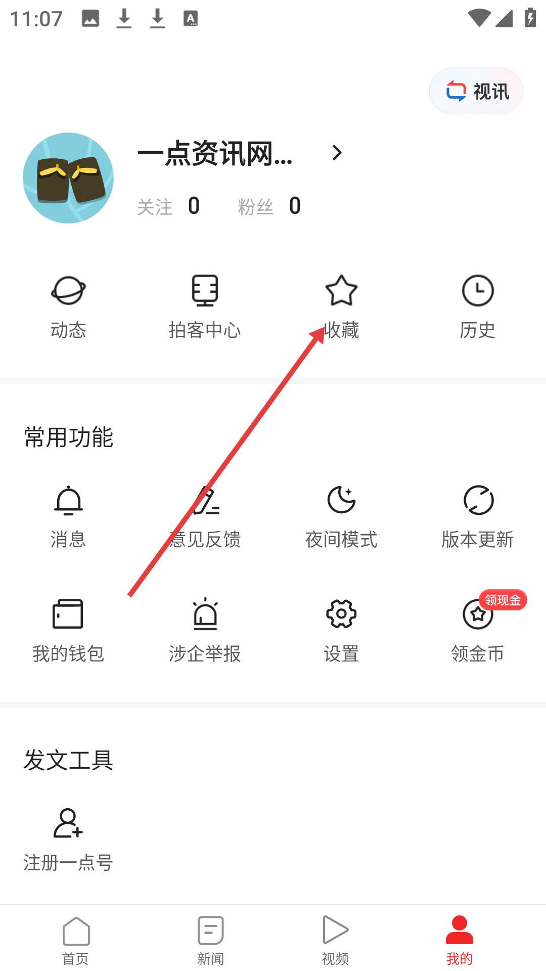 1、打開一點資訊頭條極速版進入我的頁面,在上方功能區找到收藏圖標并點擊,就能查看自己收藏的內容列表,所有收藏的內容都會按時間順序排列在這里。