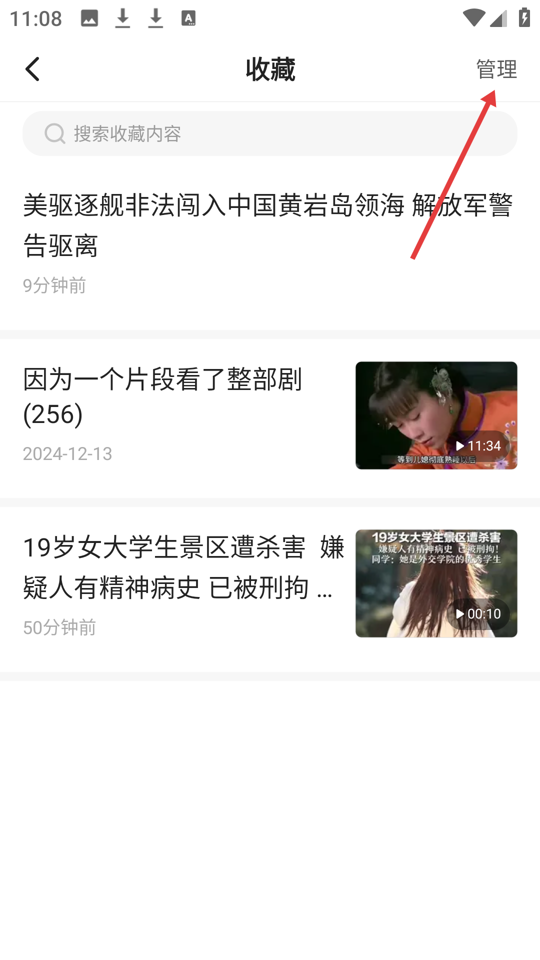 2、進入收藏頁面后點擊右上角的管理按鈕,此時收藏內容前方會出現可選框,可對要刪除的收藏進行勾選操作,可以根據需要勾選想要刪除的收藏內容。
