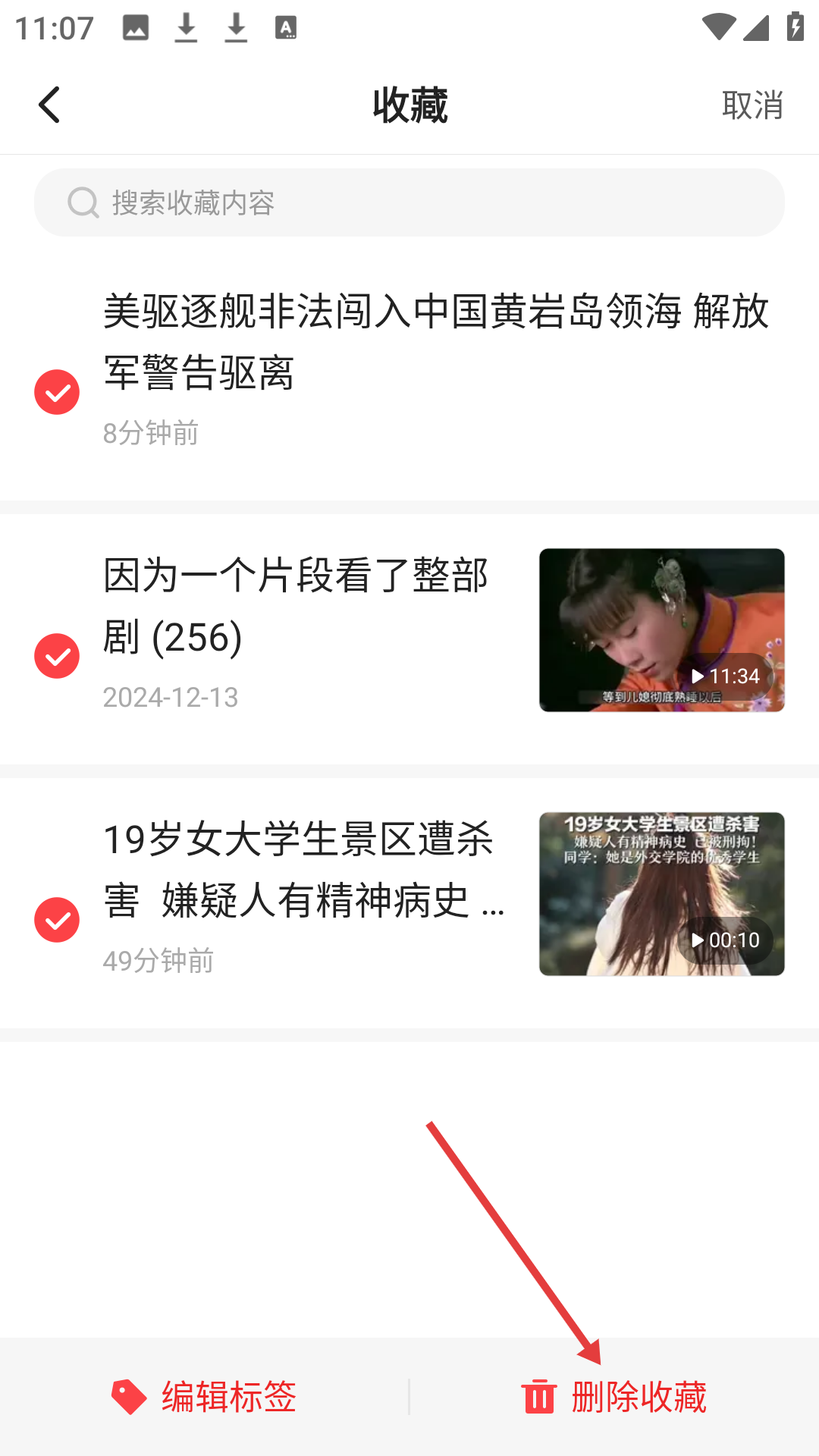 3、勾選好需要刪除的收藏內容后,點擊頁面下方的刪除收藏按鈕,再點擊確定或刪除選項,稍等片刻被勾選的收藏內容就會從列表中徹底移除,即可完成刪除操作。
