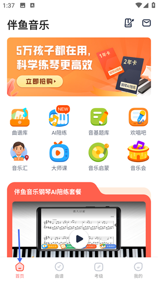 1、首頁提供曲譜庫AI陪練等核心功能入口,主打鋼琴AI陪練服務,是面向兒童的音樂學習功能總覽頁面。