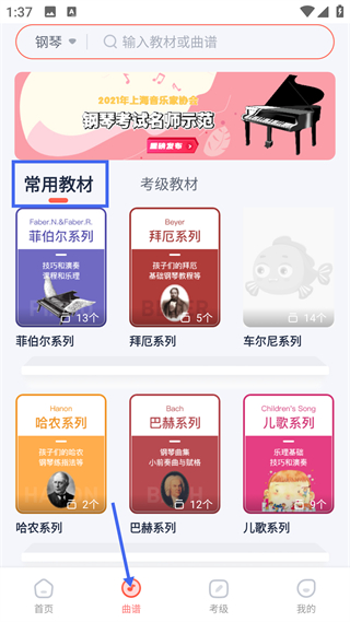 2、曲譜頁面按分類展示鋼琴教材如菲伯爾拜厄系列,支持搜索教材或曲譜,是曲譜資源的集中獲取頁面。