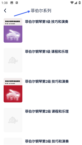 3、菲伯爾系列頁面展示該教材的分級內容,包含不同級別下的技巧演奏等類教材,適配分階段學習需求。
