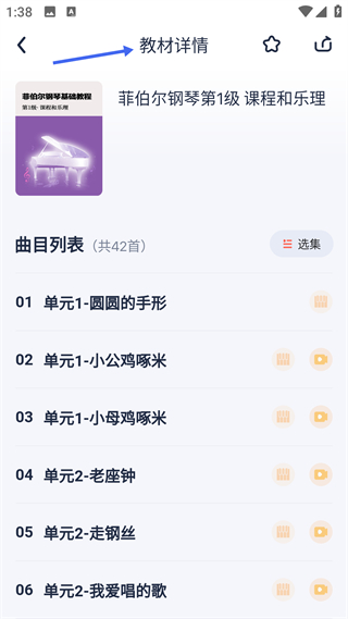4、教材詳情頁呈現單本教材的曲目列表,如菲伯爾第1級含42首曲目,支持查看具體曲目內容是學習操作頁。