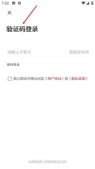 1、進入后到驗證碼登錄頁面,輸入手機號點擊獲取驗證碼,勾選同意用戶協議和隱私政策完成登錄,也可切換至密碼登錄方式。
