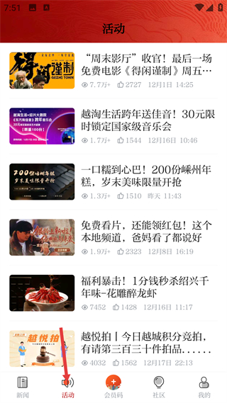 3、進入活動頁面,可查看周末影廳等各類活動信息,每條活動標注瀏覽量點贊數及時間,了解詳情后可參與對應活動。