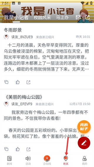 4、進入社區頁面,能查看我是小記者等板塊的用戶分享內容,點擊發布按鈕可分享自己的內容,還能與其他用戶互動。