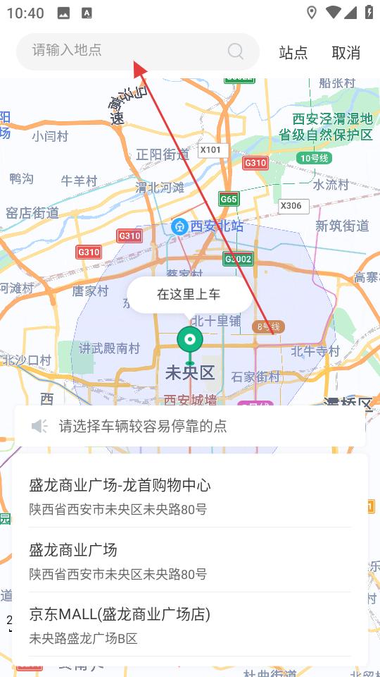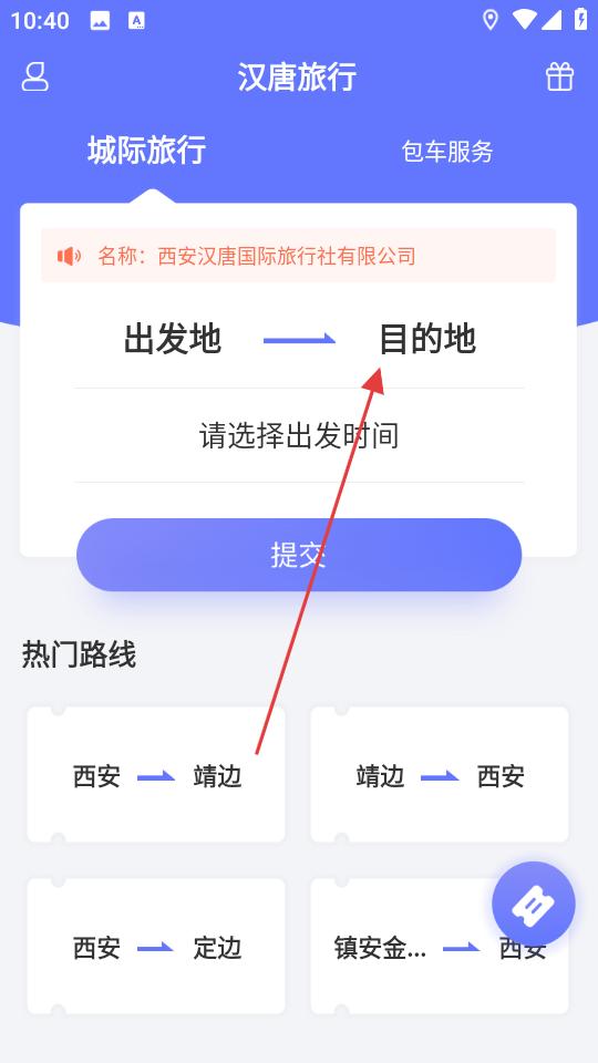 1、打開漢唐旅行APP,進入城際旅行頁,點擊目的地欄,跳轉地圖頁面,在搜索框輸入地點,選定出發地與目的地。