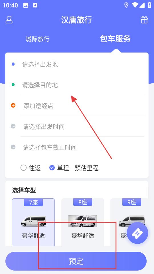 3、確定行程為單程或往返,選擇車型,核對信息無誤后,點擊預定,提交包車訂單。