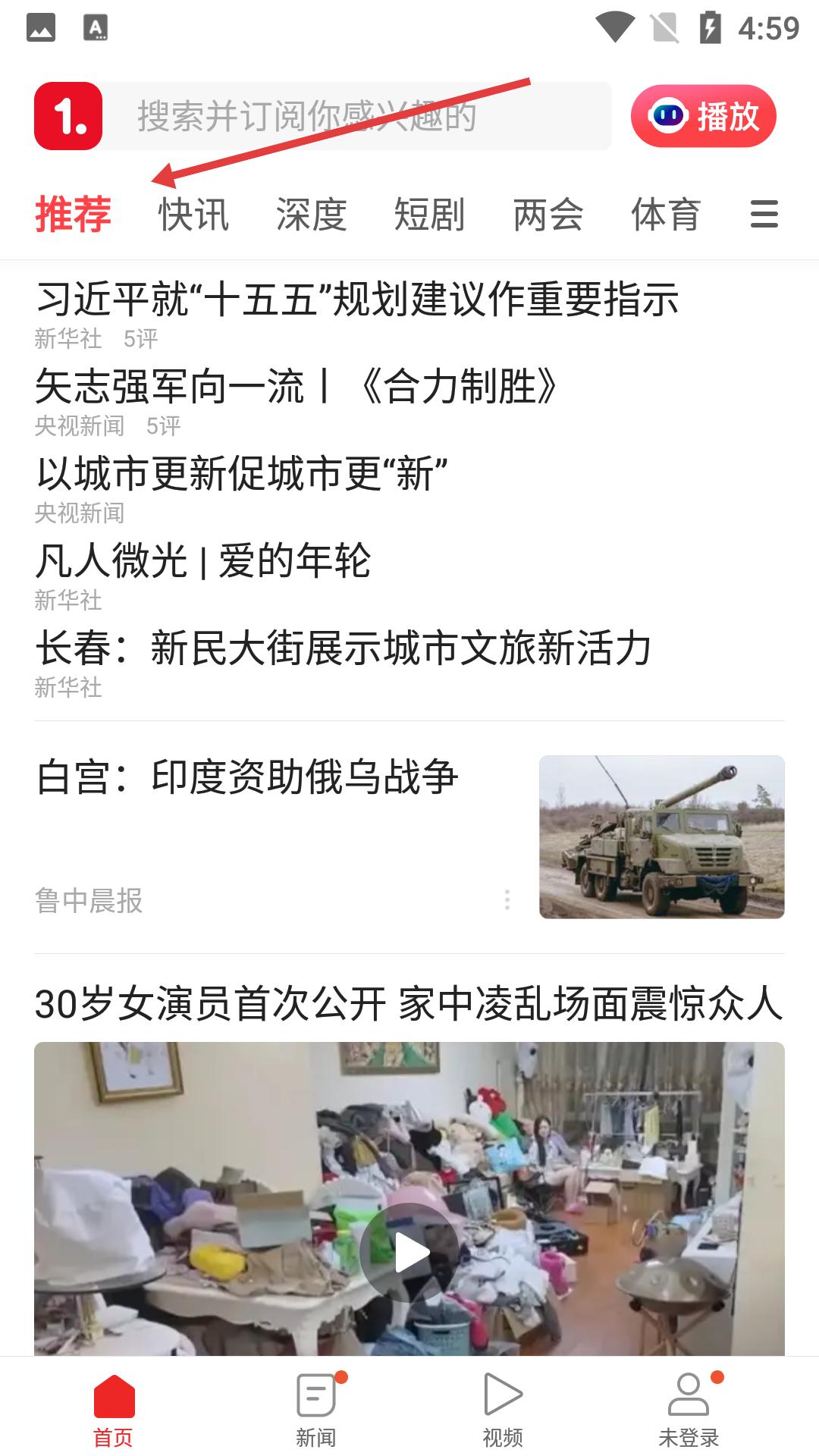 1、在首頁的推薦板塊,可以看到許多近期的重要新聞,同時我們可以選擇其他板塊比如快訊,兩會,體育等。