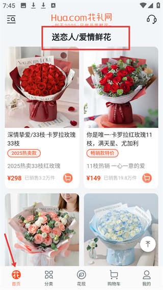 1、首頁送戀人鮮花板塊,展深情摯愛、你是唯一等花束,有2025熱賣款等標識,滿足戀人鮮花送禮需求。