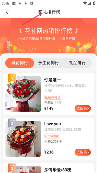 2、花禮排行榜頁,有鮮花等排行,你是唯一、Love you花束熱銷,依30日銷量每日更新,為選花提供參考。