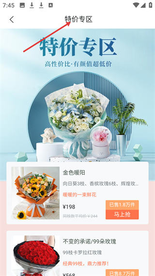 3、特價專區頁,展金色暖陽等花束,強調高性價比,金色暖陽售1.8萬件,不變的承諾售8.7萬件,適合實惠用戶。