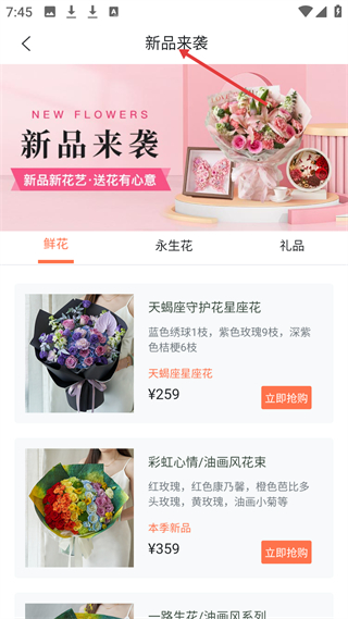 4、新品來襲頁,有鮮花等新品,展天蝎座守護花、彩虹心情花束,新品新花藝,送花有心意,滿足嘗新需求。