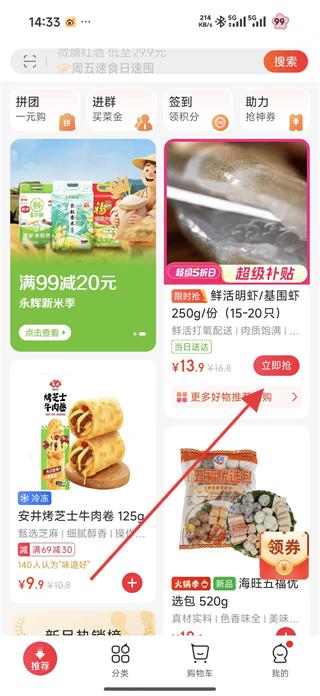 3、選好地址后回到APP首頁,可看到拼團、進群等功能入口,以及各類商品推薦,找到心儀商品,比如鮮活明蝦。