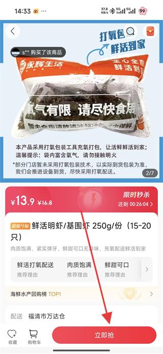 4、點擊鮮活明蝦商品進入商品詳情頁面,可看到商品價格、限時秒殺剩余時間等信息,確認后點擊立即搶按鈕,參與商品搶購。