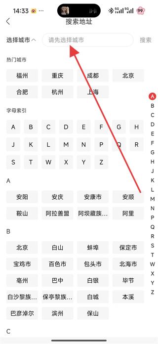 2、在搜索地址頁面可選擇城市,有熱門城市如福州、重慶等展示,也可通過字母索引查找城市,選擇好城市后進行地址搜索。
