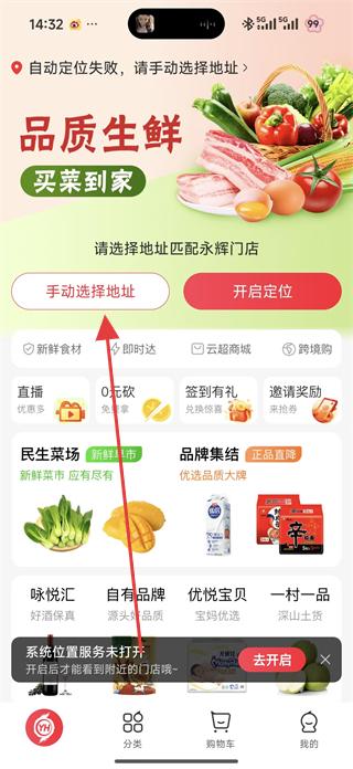 1、打開永輝生活APP,進入首頁若自動定位失敗,會提示請手動選擇地址,點擊手動選擇地址按鈕,進入搜索地址頁面。