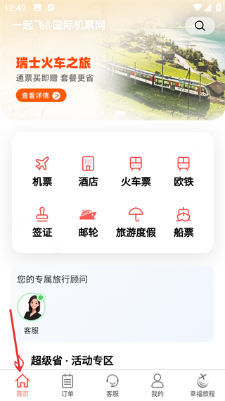 1、首頁集成機票、酒店等多類出行服務入口,提供專屬旅行顧問,設活動專區,是綜合出行服務的核心樞紐。