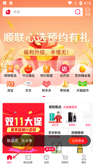 2、首頁有搜索欄,設順聯甄選等入口,推雙11家具大促,展示順聯甄選等板塊,底部有首頁、周邊優惠等欄。