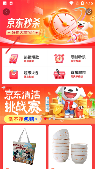 3、京東秒殺板塊,推好物大放價活動,設熱銷爆款等入口,展示清潔挑戰賽及優惠商品,滿足低價搶購需求。