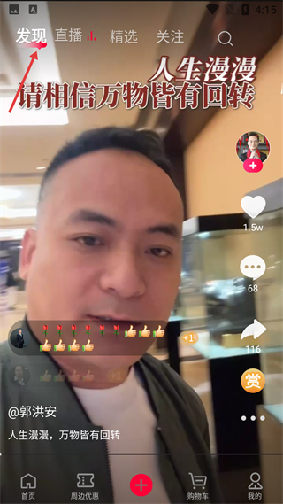 4、發現板塊有直播等分類,展示郭洪安短視頻,用戶可點贊評論分享,底部有首頁、購物車等功能欄。