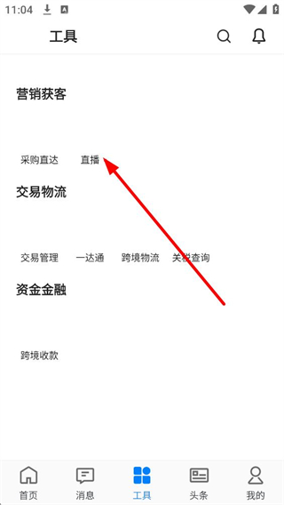 2、點擊工具進入工具頁面,有營銷獲客、交易物流、資金金融分類,營銷獲客下有采購直達、直播等功能入口,可根據需求選擇對應工具使用。