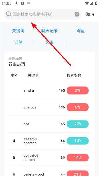 4、搜索頁面,頂部搜索欄可進行關鍵詞、聊天記錄等多維度搜索,下方展示最近30天行業熱詞及搜索指數,幫助用戶了解行業關鍵詞熱度,優化搜索和營銷策略。