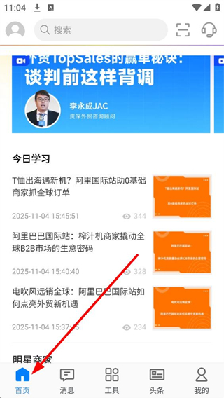 1、進入阿里國際站首頁,頂部有搜索欄,可查找信息,頁面展示今日學習板塊,有各類外貿相關文章,底部導航欄有首頁、消息、工具等選項,方便用戶瀏覽和使用功能。