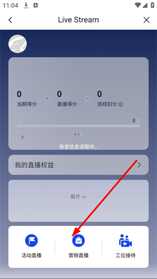 3、進入直播功能頁面,可看到當期得分、直播得分等數據,還有我的直播權益板塊,可選擇活動直播、營銷直播、工位接待等直播類型開展直播活動。