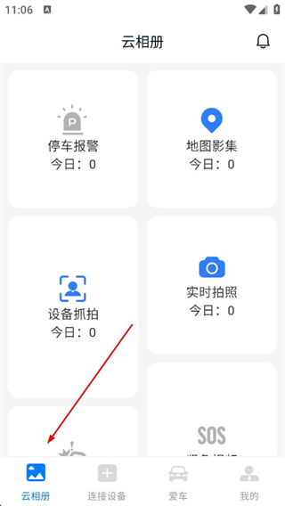 1、打開軟件進入云相冊頁面,查看停車報警地圖影集等功能模塊,點擊底部連接設備選項,進入WiFi綁定頁面。