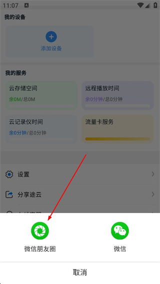 4、在分享彈窗中選擇微信朋友圈或微信渠道,將設備相關內容分享出去,完成分享操作后可點擊取消關閉彈窗。