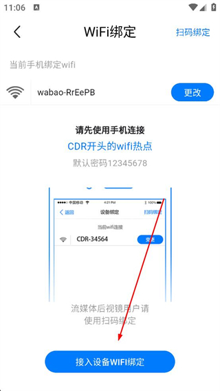 2、在WiFi綁定頁面查看當前手機綁定的WiFi,按照提示連接CDR開頭的WiFi熱點,輸入默認密碼后點擊接入設備WiFi綁定。
