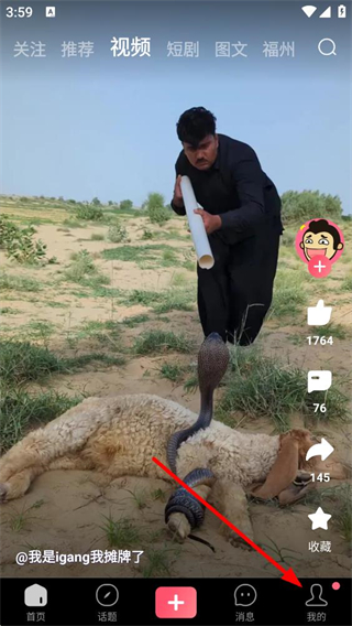 1、進入應用首頁可瀏覽視頻等分類內容,查看用戶發布的動態,可對內容進行點贊評論分享收藏等互動操作,點擊底部我的板塊可進入個人頁面。
