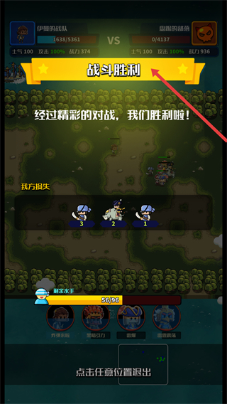 3、戰斗勝利后可獲得獎勵,查看我方損失,點擊任意位置退出戰斗界面,繼續游戲操作。