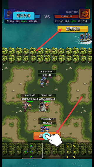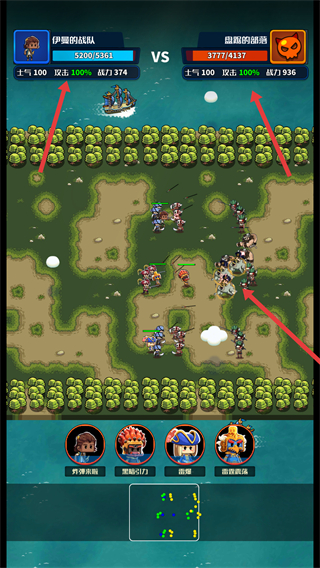 1、可調整陣型,布置己方部隊后點擊戰斗,與敵方如兇狠的海賊交戰,推進游戲進程。