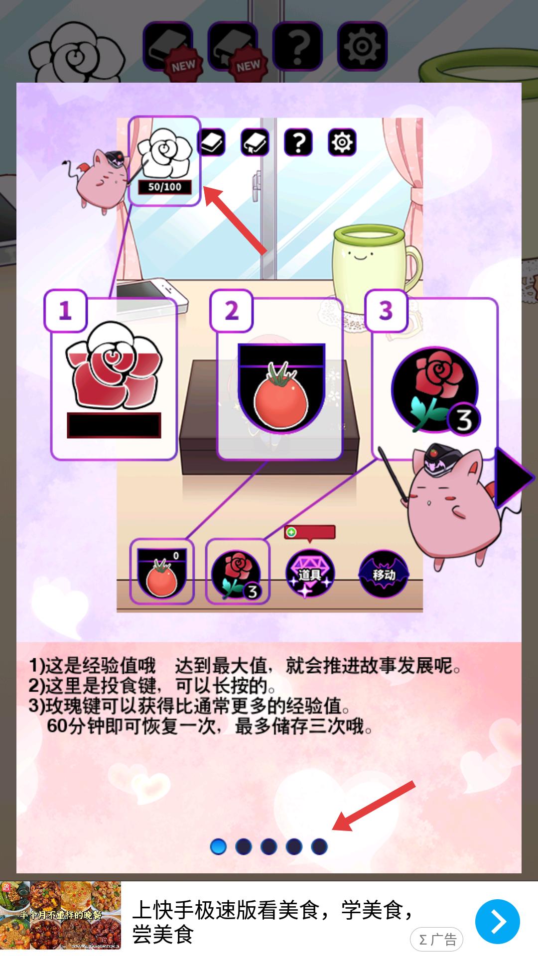 3、教程界面會介紹經驗值、投食鍵、玫瑰鍵等功能,經驗值滿會推進故事,投食鍵可長按,玫瑰鍵能獲更多經驗且定時恢復。