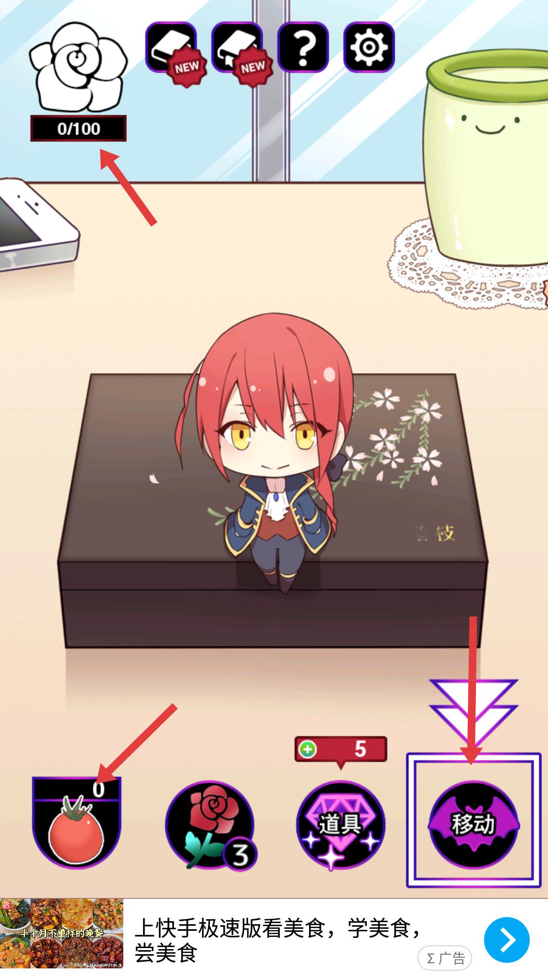 4、主界面有經驗值顯示和移動等功能鍵,通過移動鍵可操控角色移動,同時利用投食、玫瑰鍵獲取經驗,提升經驗值以推進故事。