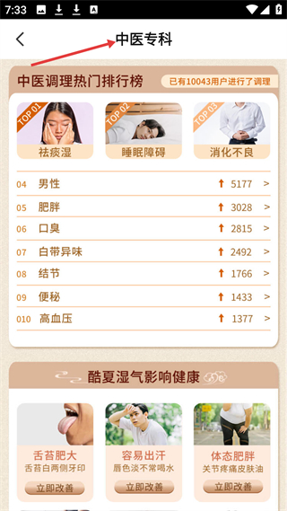 1、中醫專科板塊有中醫調理熱門排行榜,涵蓋祛痰濕、睡眠障礙等多種調理方向,還有酷夏濕氣健康改善內容,助力中醫健康管理。