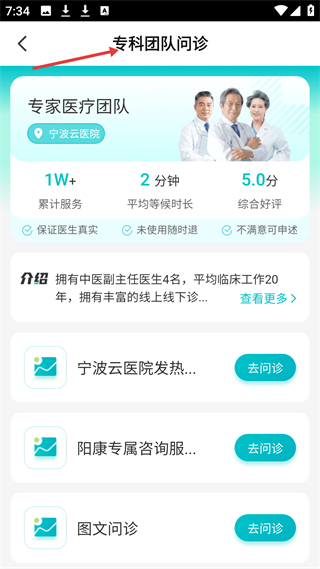 2、專科團隊問診板塊有寧波云醫院專家團隊,提供發熱、陽康等問診服務,團隊醫生專業,服務有保障。