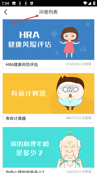 3、問卷列表板塊有HRA健康風險評估、壽命計算器等問卷,參與人數多,助力用戶了解自身健康和心理狀況。