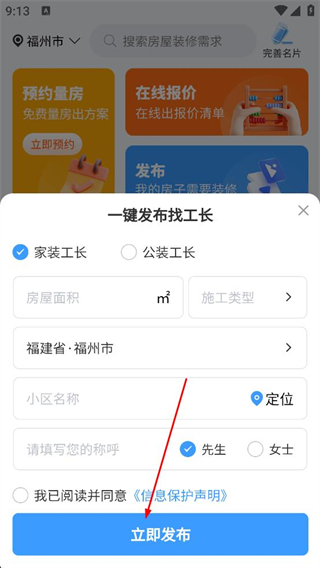2、進入主界面后,點擊發布相關入口,彈出一鍵發布找工長窗口,選擇家裝工長類型,填寫房屋面積施工類型等信息。