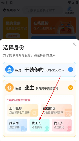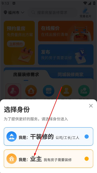 3、登錄后彈出選擇身份窗口,選擇業主身份,確定自身有房屋需要裝修,即可進入對應服務選擇頁面,準備挑選所需裝修服務。