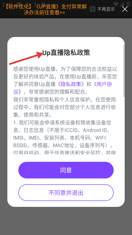 1、Upuplive直播應用開啟時的界面,醒目提示閱讀隱私政策,強調保護個人信息,提供同意與不同意并退出兩個操作選項。